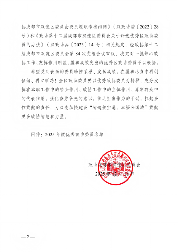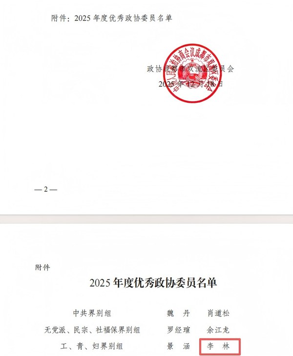 近日,政协成都市双流区委员会正式发布表彰文件,我司副总经理李林同志荣获“2025年度优秀政协委员”称号。